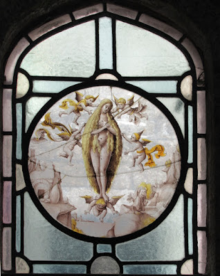 One thing I see is that these are not windows that were here when it was the monastery. The monastery was closed during the time of king Henry but some of these windows are clearly baroque, which means they are later. What is more, at least some were not created in England. One of them has an inscription in Dutch, another shows a ship with a Dutch flag (Holland didn't exist at the time of king Henry). Still another shows a pope and a cardinal, which means it wasn't created in the protestant England. One pictures an interior with a window with a stained glass in it but it is a very different window. Some are assembled in a somewhat messy way, for example in one just beneath the main scene one can see a cupid, but aside and without a head, and still lower there are some feet, but upside down.